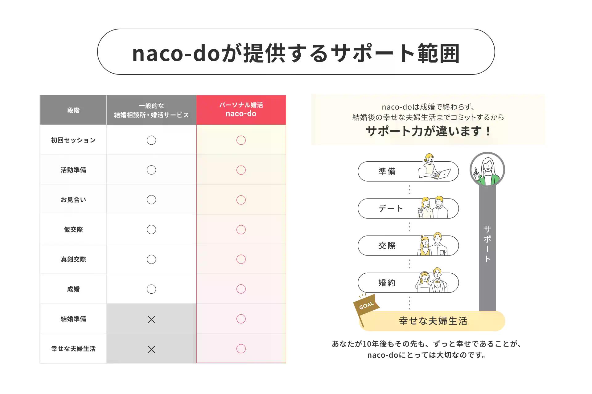 パーソナル婚活 naco-doにおいては、成婚がゴールではなく、その先の幸せな結婚生活がゴール。そのゴールまでのすべてのプロセスに、専任のサポートチームが伴走します。